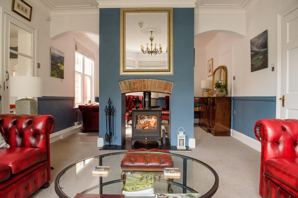 – Guests stay cosy in front of a log fire in the lounge during the colder months.